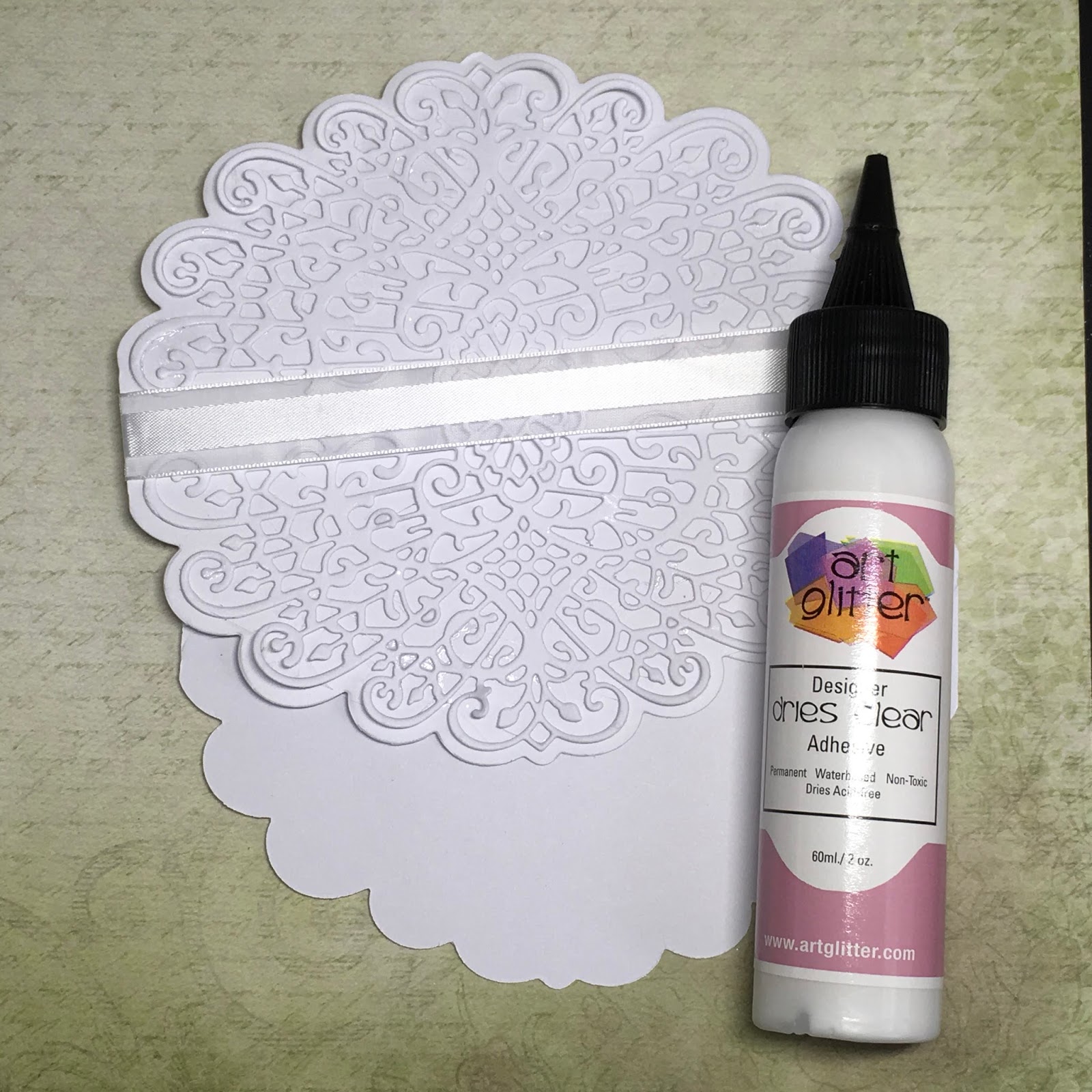 adhere the outer to a tent fold card. Glitter and adhere the centre of the card front on an