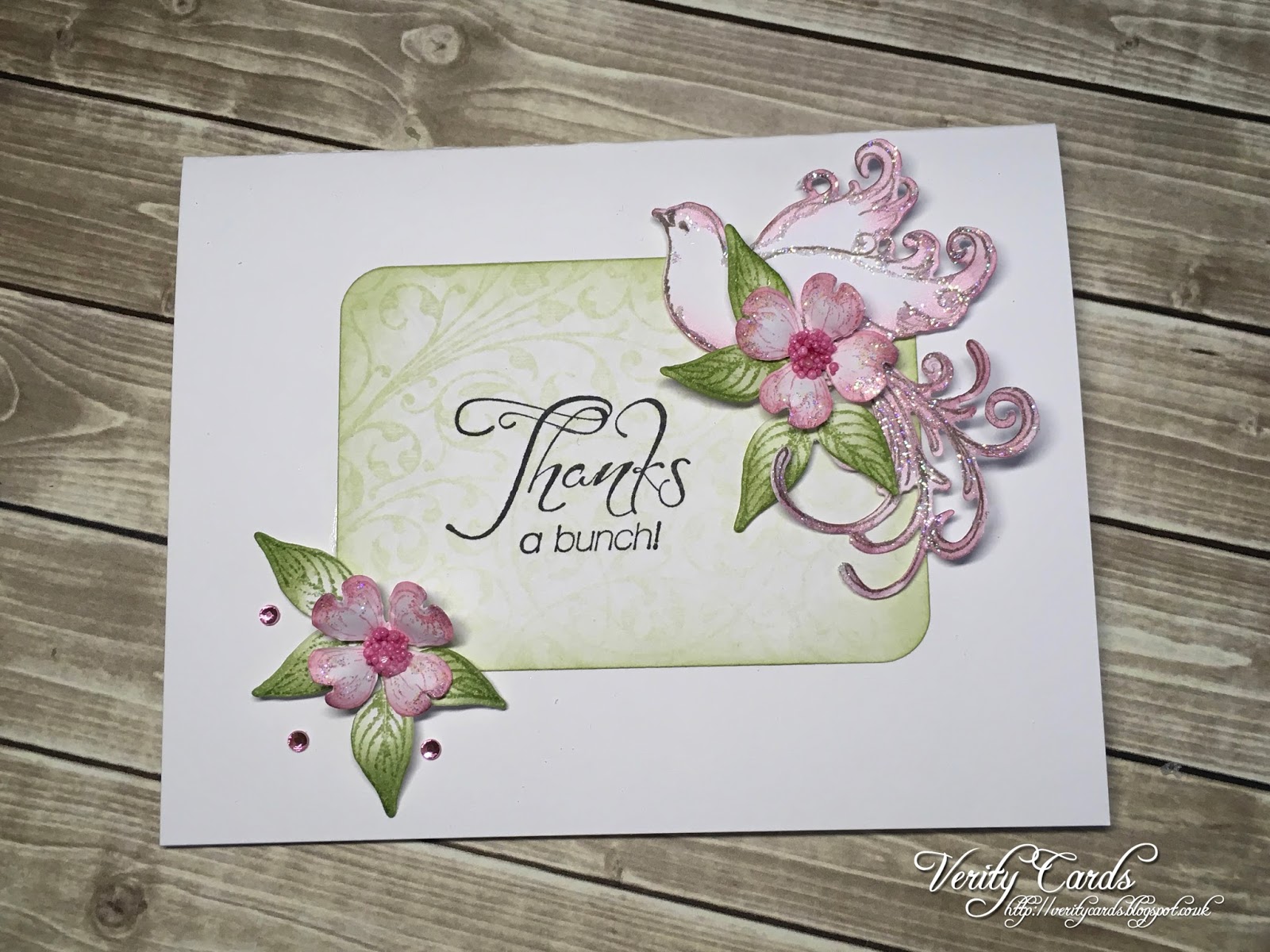 Ink the edges and adhere with 3D foam pads to the card. Using the Brown ink stamp the dove and colour with the coral and Crimson Copper Ink. Glitter the dove and adhere to the card. Stamp, cut, shape and colour the flowers and leaves. Adhere prills to the stamens and adhere to the flower centres. Adhere the flowers and leaves to the card and your project is complete.