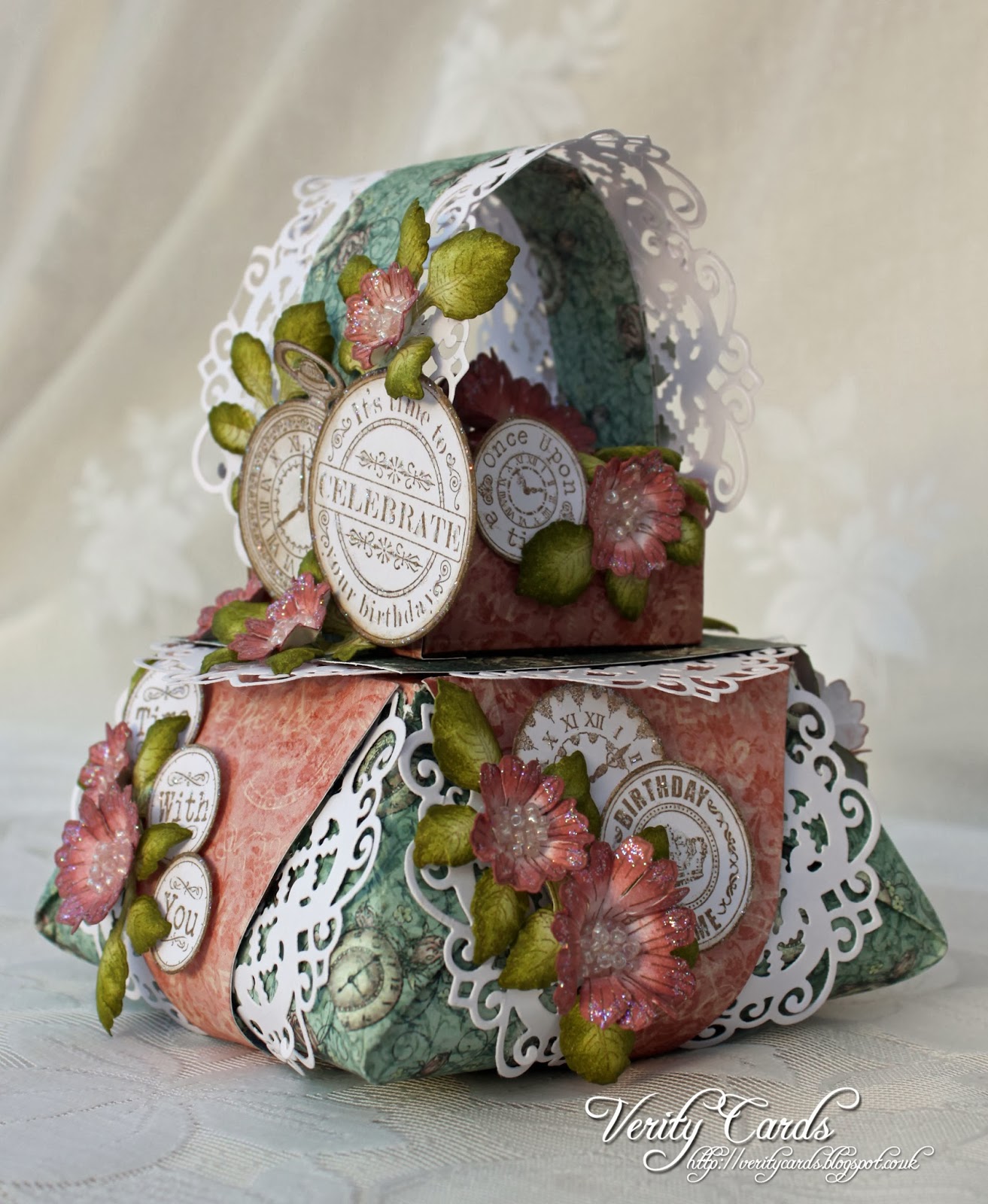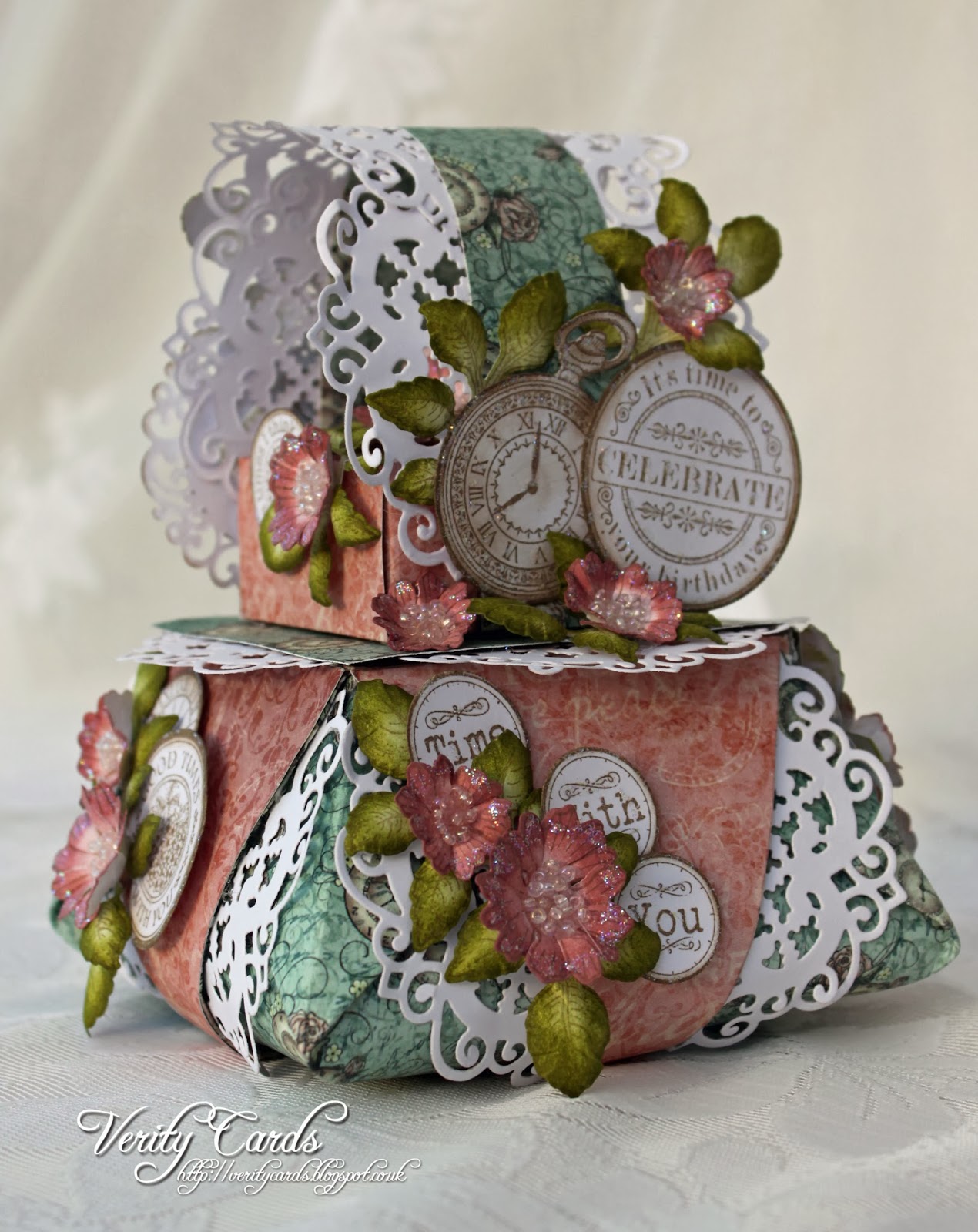 Adhere the flowers, sentiments, clocks and leaves on the box. Each side of the box is